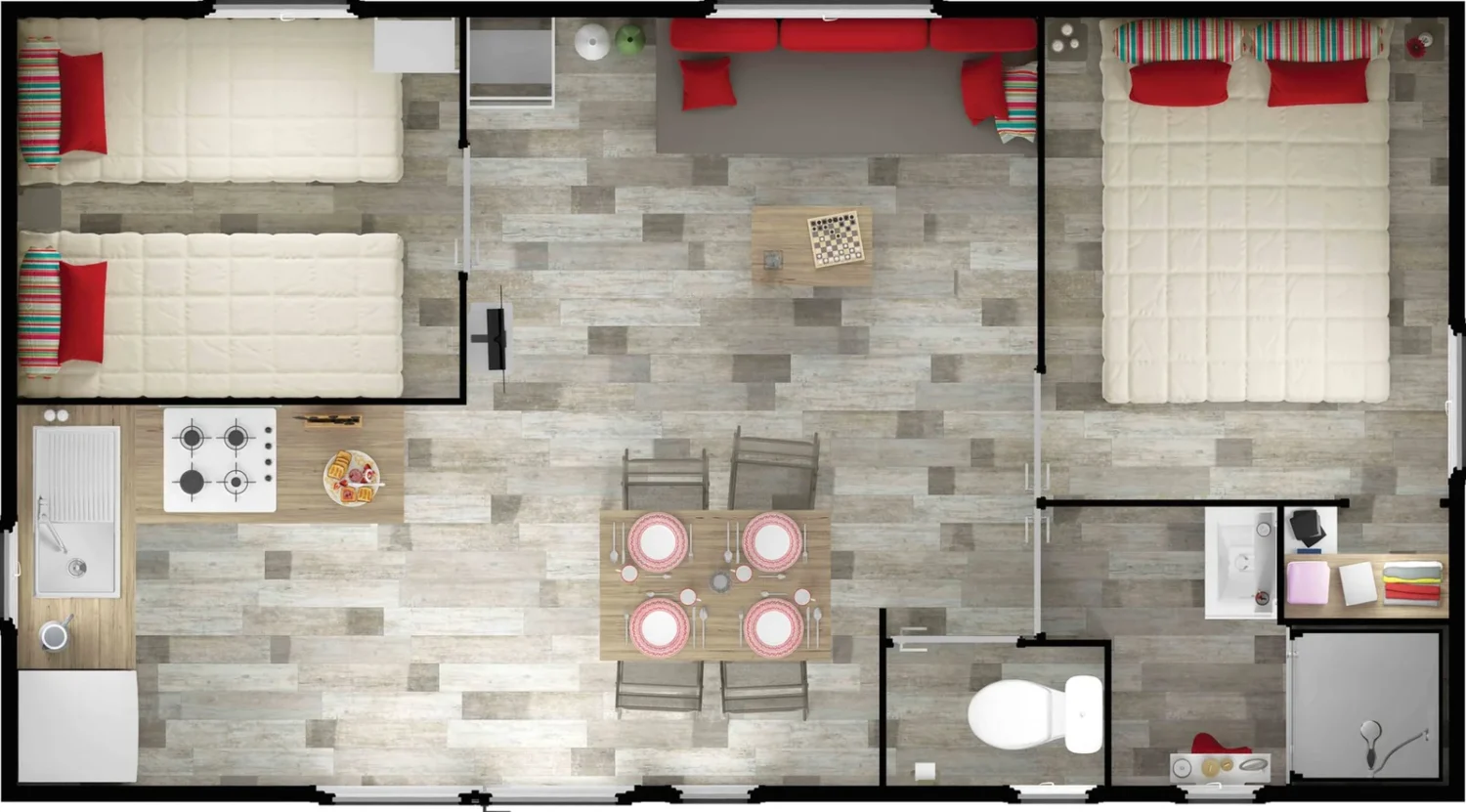 Mobile-home moderne de 27,35 m² avec grande terrasse couverte. Espace de vie lumineux combinant cuisine équipée et salon confortable. Deux chambres séparées. Salle de bain avec douche, WC séparés. La grande terrasse couverte est l’atout majeur : idéale pour tous vos repas et moments de détente à l’ombre.